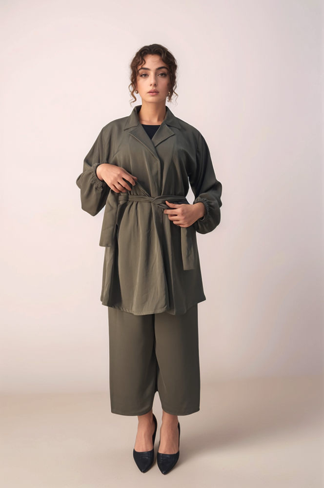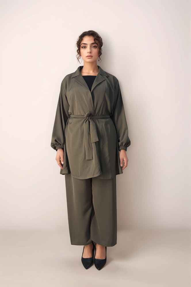 طقم سفر صيفي قطعتين : بليزر بطول ميدي و بنطال و اسع .