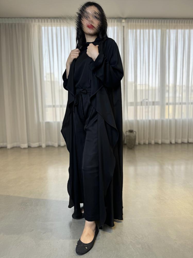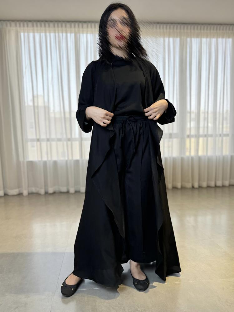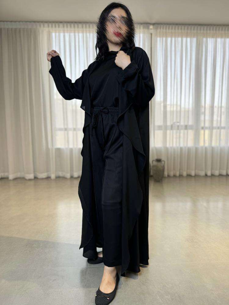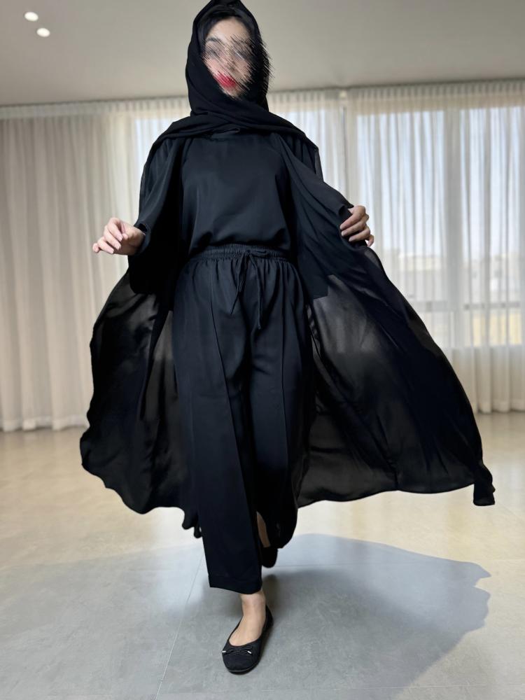 الملحقات : طرحة، توب بياقة تغطي الرقبة، بنطال واسع مع حزام مطاط قابل للتحكم