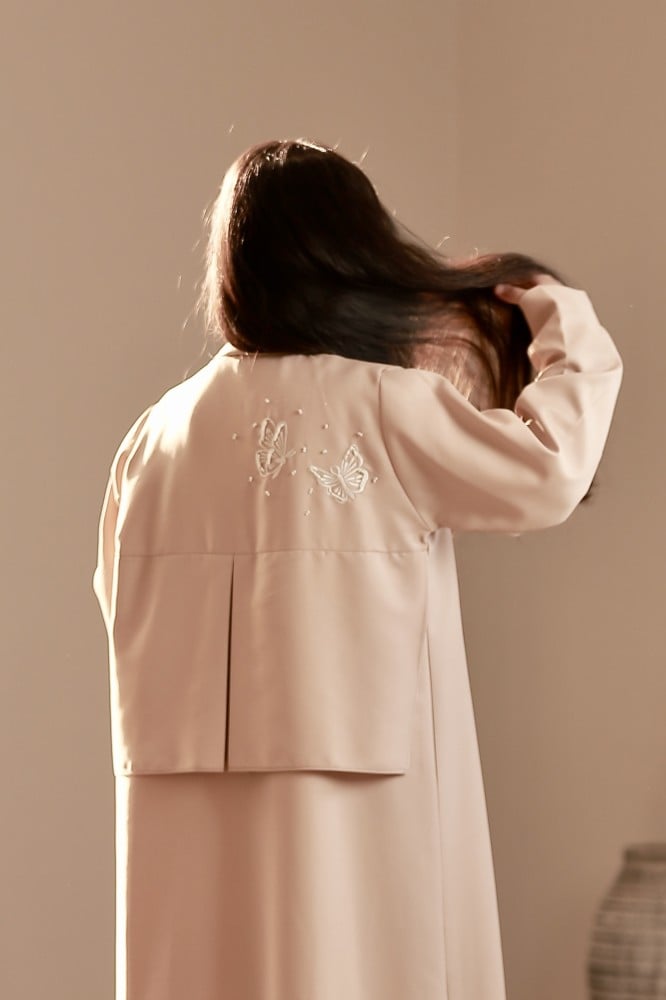 وصف العباية: عباية بلون نود مع تطريز وشك على شكل فراشتين على الكتف.