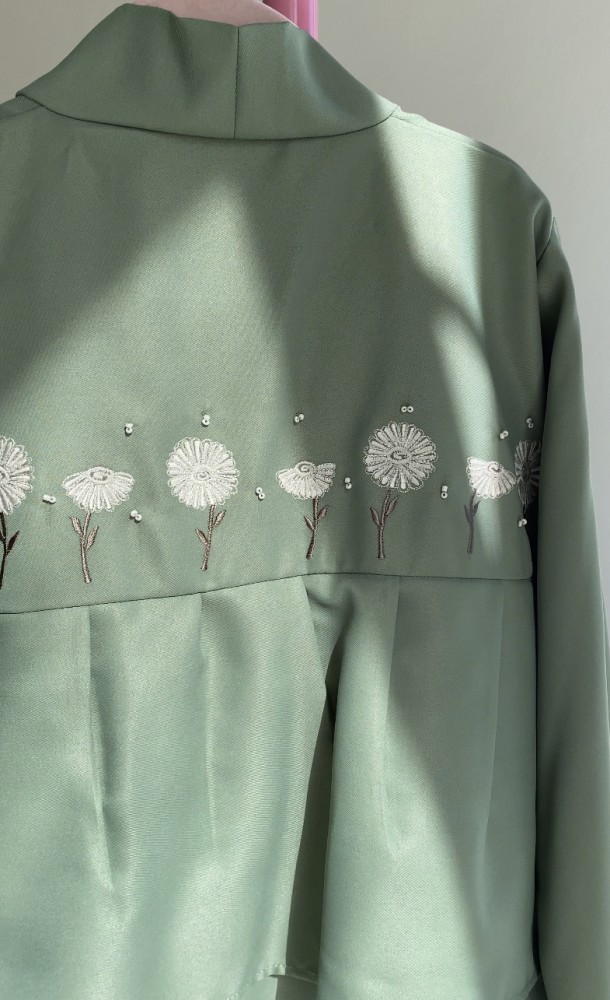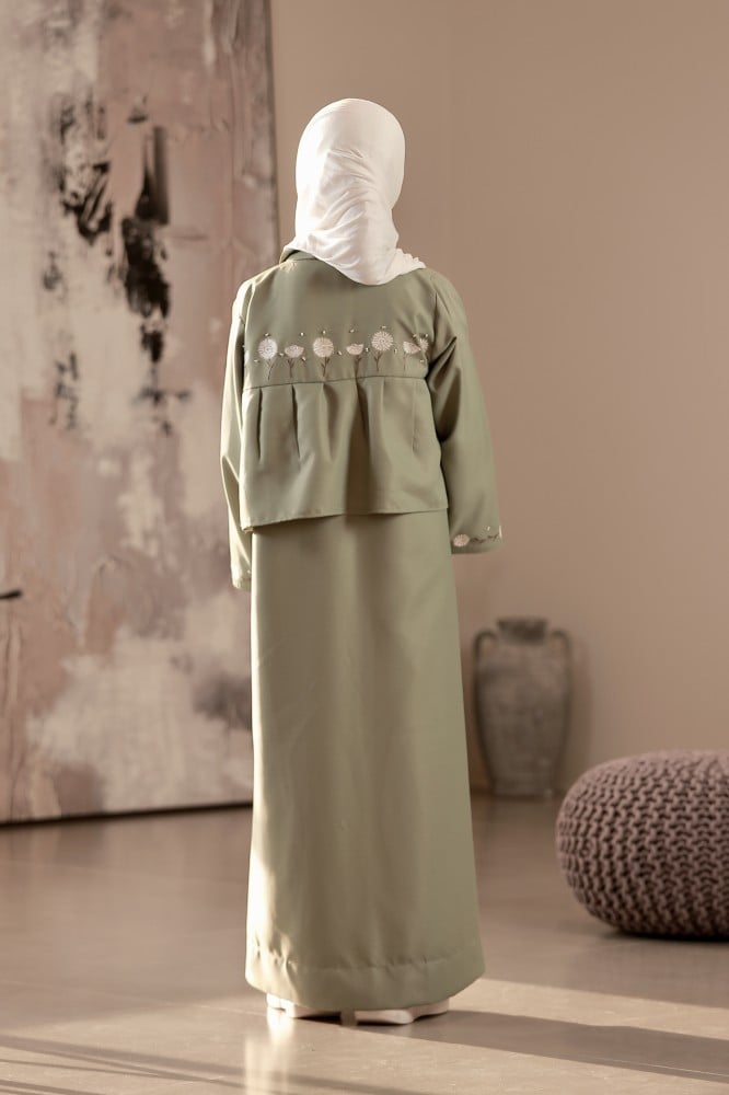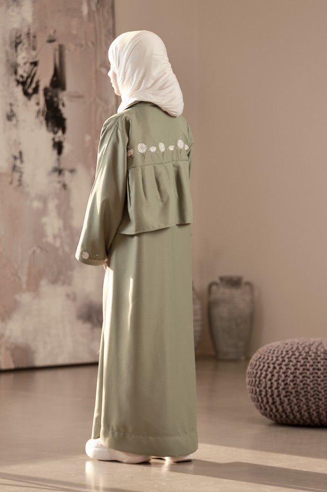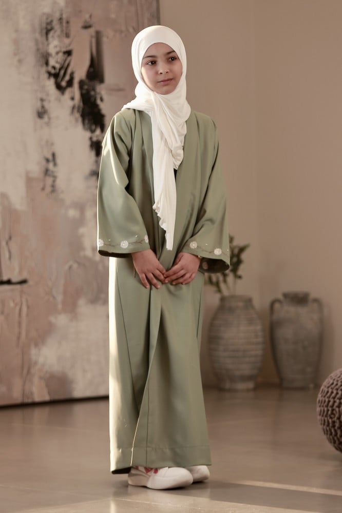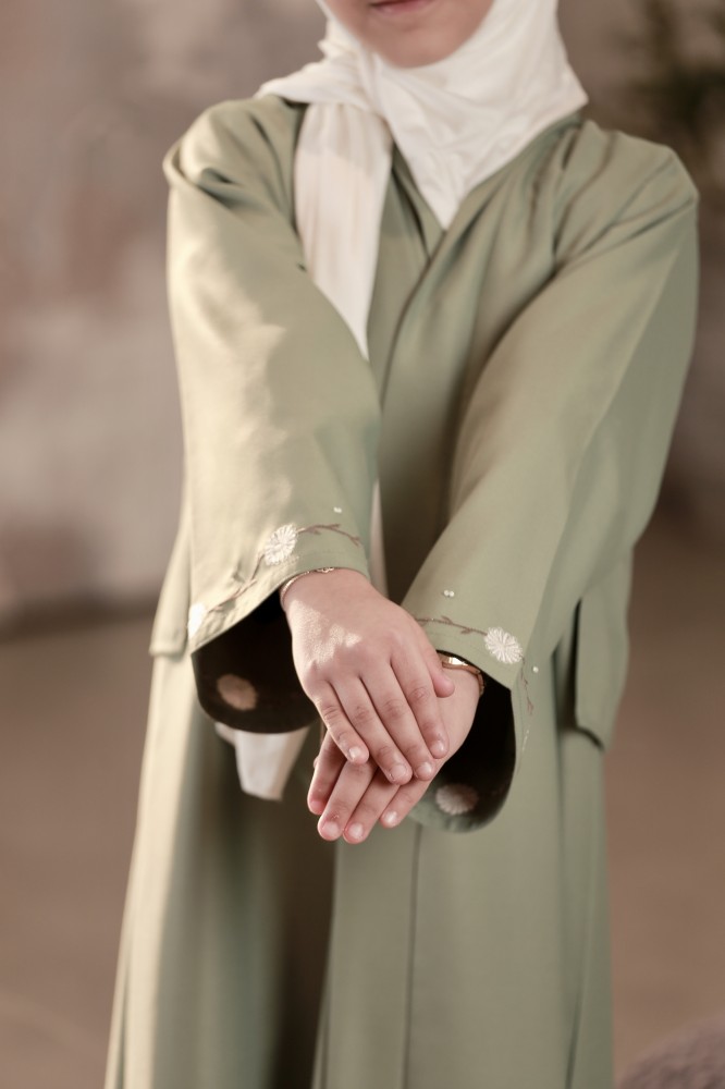 وصف العباية: عباية بلون فستقي مع تطريز و شك على شكل زهرة البابونج الجميلة