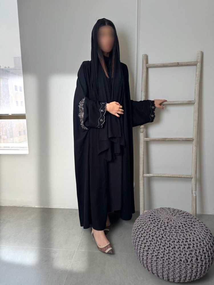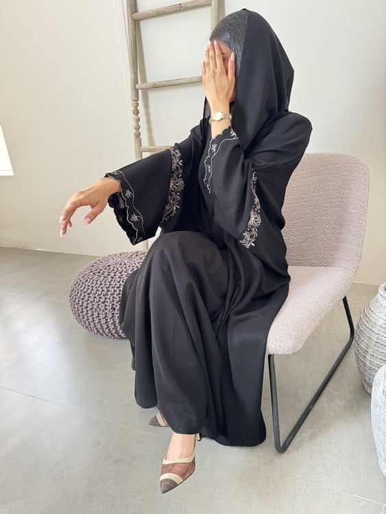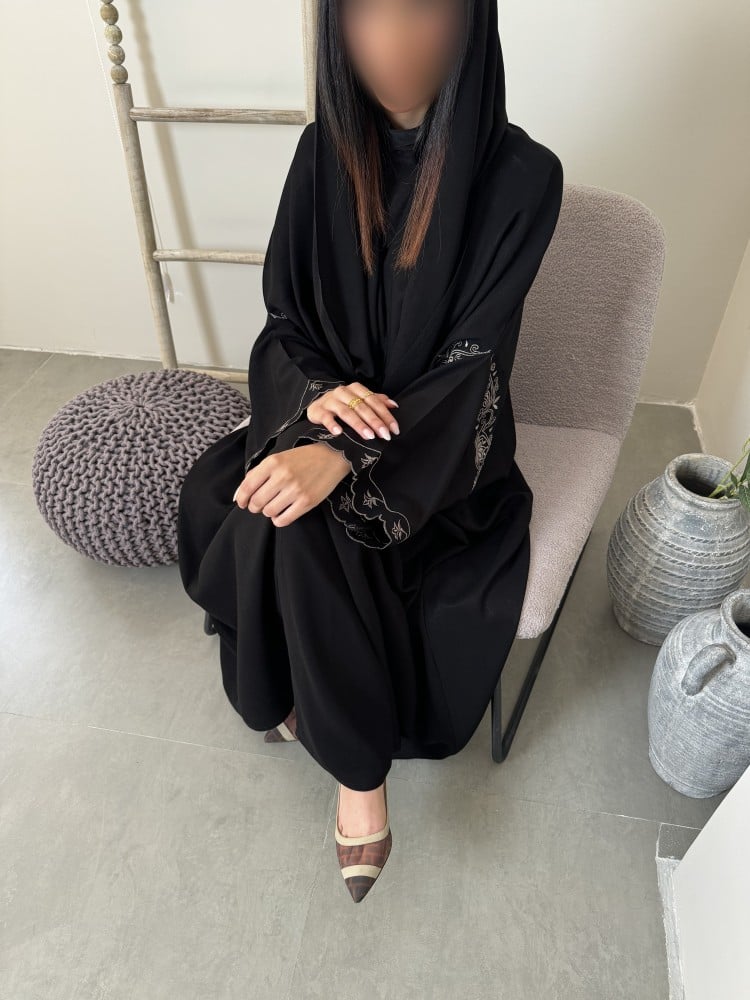 وصف العباية: قصة كيب أنيقة مع أكمام واسعة مطرزة باللون الكوبر