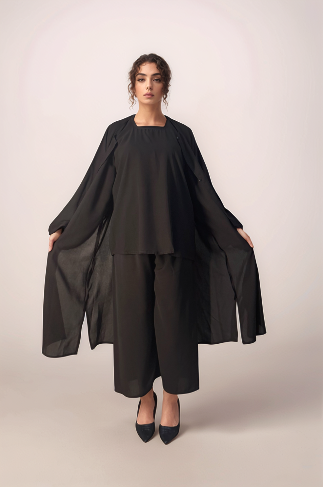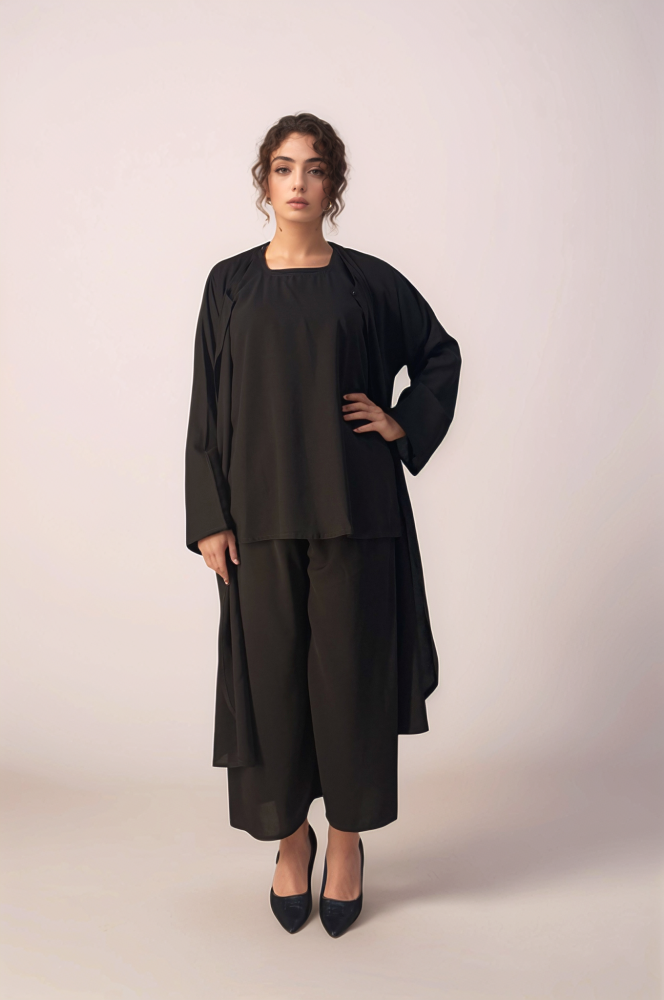 طقم سفر صيفي ثلاث قطع ، توب طويل ، بلوزة داخلية بدون أكمام ، و بنطال و اسع .